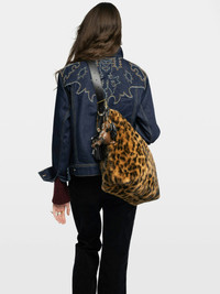 Hobo bag in leopard faux fur with leather shoulder strap and signature wings. Description & details - Hobo bag in leopard faux fur - Adjustable and removable leather handle - Magnetic closure - Interior zipped pocket - Embossed wings signature - Carried by hand or shoulder 28 x 35 x 14 cm Composition 100% Polyester** Care - Avoid contact or repetitive rubbing with light-coloured clothing to limit colour transfer - Be careful not to rub your product against abrasive surfaces - Avoid contact with liquids - Keep away from direct sunlight, heat and rain. If it gets wet, dry it immediately with a soft cloth - Store it in the case supplied at the time of purchase - To clean it, use a soft, dry cloth. Never use soap or solvents Product code: LWBA04121_COGNAC