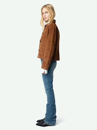 Women's cropped suede jacket with embossed wings on the back. Description & details - Women's Cognac camel cropped suede jacket - Pointed collar and buttoned fastening - 2 flap pockets - Long sleeves - Topstitching and embossed signature wings on the back Model is 177 cm / 5' 9" and is wearing a size S This item is true to size. We recommend buying your usual size. Composition 100% Goatskin Care This garment should be cared for by a leather professional. Product code: RWOW01246_COGNAC