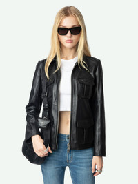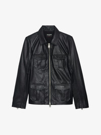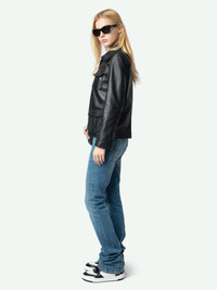 Women's leather jacket with zip details and embossed wings on chest. Description & details - Women's black smooth leather jacket - Pointed collar - Front fastening, side vents and zipped cuffs - 4 flap patch pockets, one featuring embossed wings on the chest - Long sleeves - Topstitching Model is 177 cm / 5' 9" and is wearing a size S If you’re between two sizes, we recommend choosing the larger size. Composition 100% Lambskin Care This garment should be cared for by a leather professional. Product code: RWOW01238_BLACK