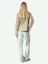 The Listy elevates everyday knitwear with a flash of quiet shine. Spun with fine metallic thread, this lurex sweater glows in soft gold while keeping a feather-light feel. A shirt-style collar is edged with metal eyelets and finished with long ties you can knot or let hang loose for a subtle rock nod. Long sleeves and buttoned cuffs add structure, and the relaxed shape slips easily over silk, denim, or leather. The result is a lurex sweater that moves from coffee to last-call sets without missing a beat. Description & details - Gold viscose-blend lurex sweater woven with fine metallic thread for understated shimmer - Shirt collar threaded with metal eyelets; long ties allow versatile styling - Long sleeves finished with buttoned rib cuffs for a neat edge - Straight, hip-grazing hem gives the lurex sweater easy layering potential - Lightweight gauge keeps the knit comfortable from early spring through late autumn Model is 177 cm / 5' 9" and is wearing a size S This item is true to size. We recommend buying your usual size. Composition 52% Viscose 35% Polyester 13% Metallic fiber Care - Hand-wash or machine-wash on a 20°C wool cycle with a maximum spin speed of 400 rpm - Do not wring - Air dry flat - Iron inside out at a maximum of 110°C, avoiding any customised details Product code: KWSW02780_GOLD