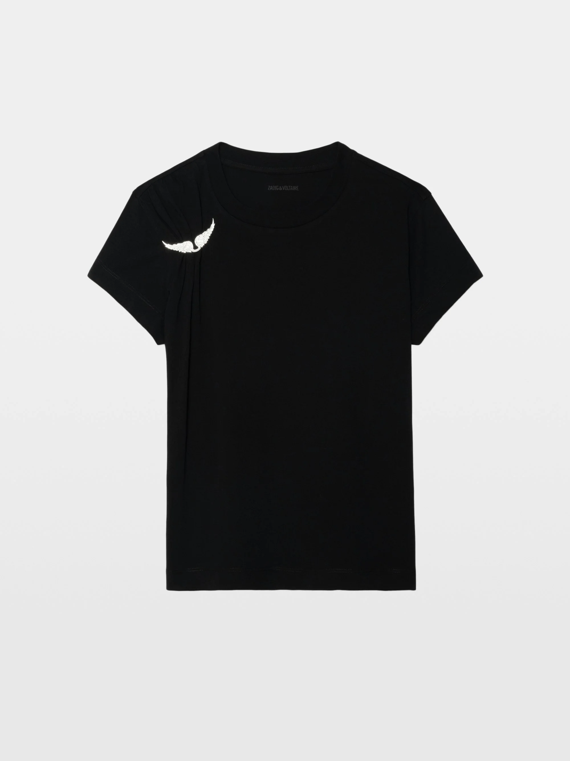 Pleated short-sleeve t-shirt with wing brooch. Description & details - 100% cotton t-shirt - Pleated fabric with decorative wing brooch at front - Crew neck - Short sleeves Model is 178 cm / 5' 10" and is wearing a size S This item fits true to size. Choose your usual size. Composition 100% Cotton* Care - Machine-wash inside out on a 30°C delicate cycle with similar colours - Air dry - Iron inside out at a maximum of 110°C, avoiding any customised details Product code: JWTS02871_BLACK