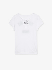 Short-sleeved henley t-shirt with print on the back. Description & details - Henley t-shirt T-shirt in 100% cotton - Henley t-shirt collar with 5 buttons - "Voltaire Paris" inscription on the back - Short sleeves Model is 180 cm / 5' 10" and is wearing a size S This item fits true to size. Choose your usual size. Composition 100% Cotton* Care - Machine-wash inside out on a 30°C delicate cycle with similar colours - Air dry - Iron inside out at a maximum of 110°C, avoiding any customised details Product code: JWTN02647_WHITE