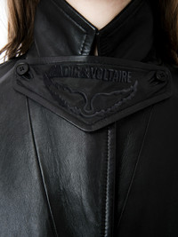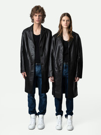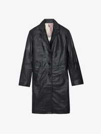 Long black smooth leather buttoned coat. Description & details The Macari coat is part of the UNISEX collection. A free-spirited wardrobe by Zadig&Voltaire, the UNISEX collection represents the fusion of feminine and masculine features. - Unisex long black smooth leather coat - Notched collar, removable tab with embossed wings symbol and long sleeves - Button fastening - Vent in middle of the back with a buttoned tab - 2 side pockets Model is 170 cm / 5' 6" and is wearing a size S This item is true to size. We recommend buying your usual size. Composition 100% LAMBSKIN Care This garment should be cared for by a leather professional. Product code: RWCO00035_NOIR