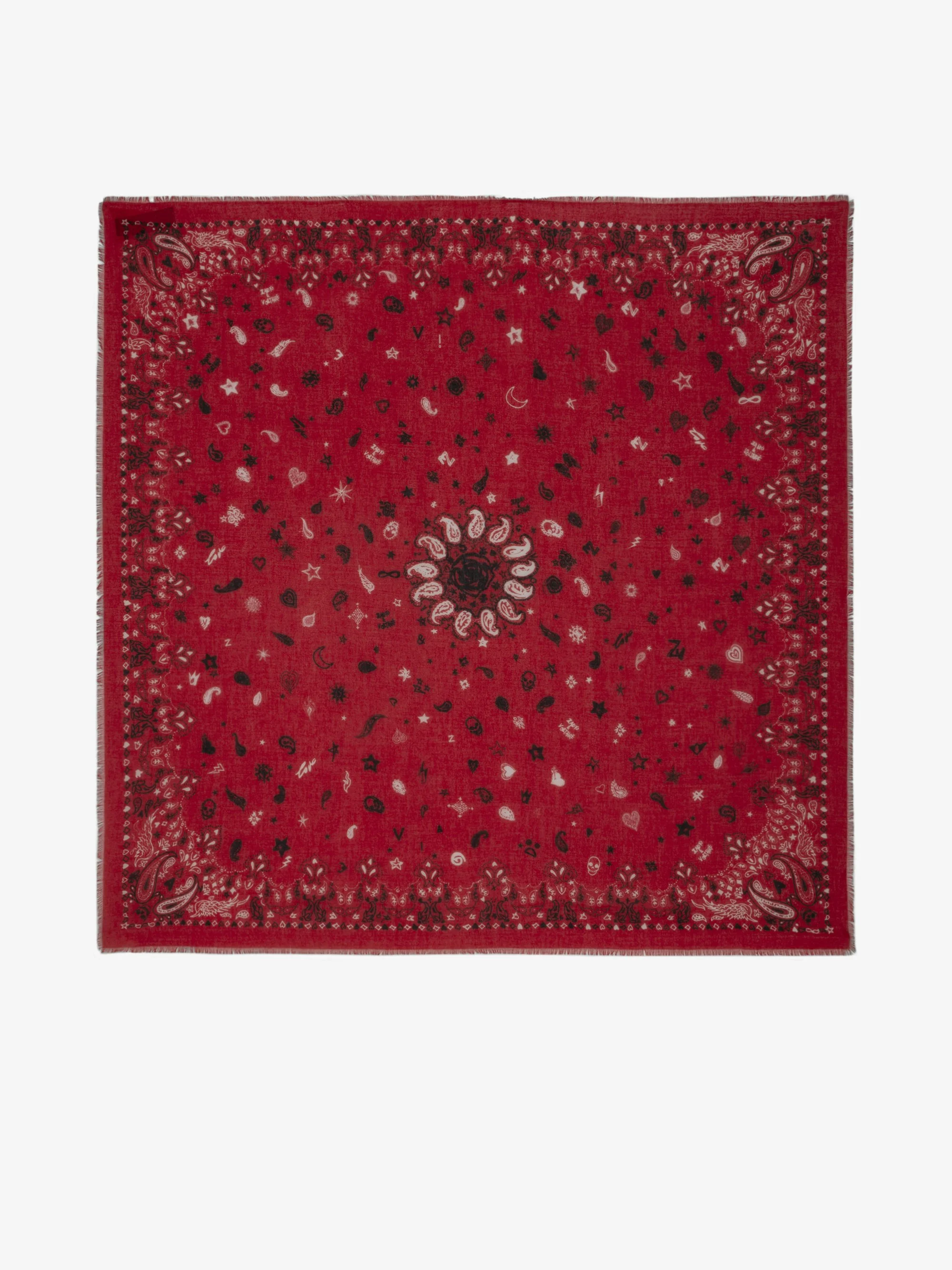 Red cotton scarf with bandana print. Description & details - Power red cotton square scarf for women - Bandana print - Frayed edges - Made in Italy 120 x 120 x 120 cm Composition 100% Cotton** Care - Machine-wash inside out on a 30°C delicate cycle with similar colours - Air dry - Iron inside out at a maximum of 110°C, avoiding any customised details Product code: OWSC01499_POWER
