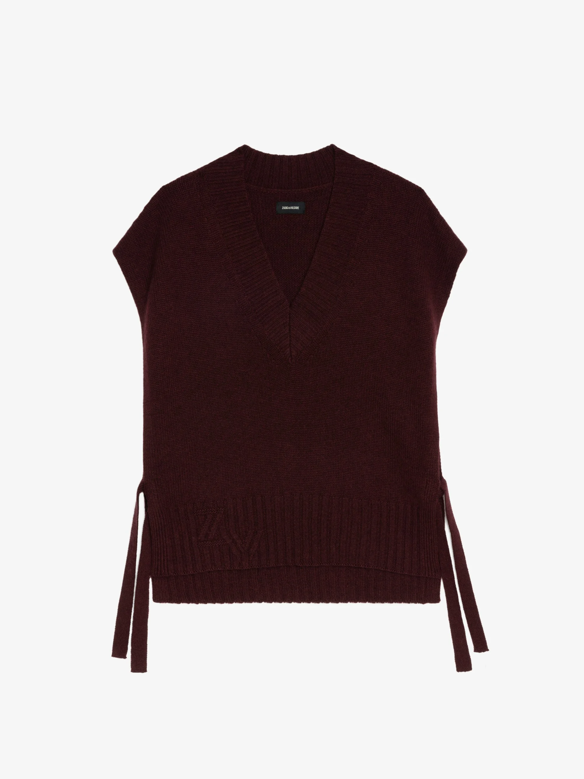 Sleeveless V-neck sweater. Description & details - Sweater in 100% cashmere - Sleeveless - V-neck - Side slits and tie details - Ribbed edges and ZV signature Model is 180 cm / 5' 10" and is wearing a size S This item is true to size. We recommend buying your usual size. Composition 100% Cashmere Care Hand or machine wash your knitwear at 20°C in a pillowcase or washing bag. Do not use fabric softener or leave your knit soaking in water. The spin speed must not exceed 400 rpm. Dry flat on a towel away from direct sunlight and heat. Product code: KWSW01523_BURGUNDY
