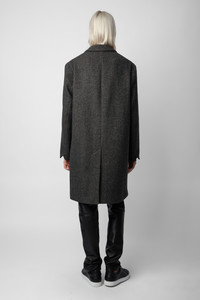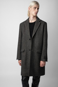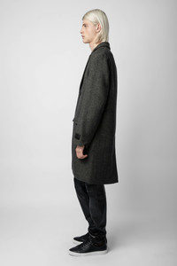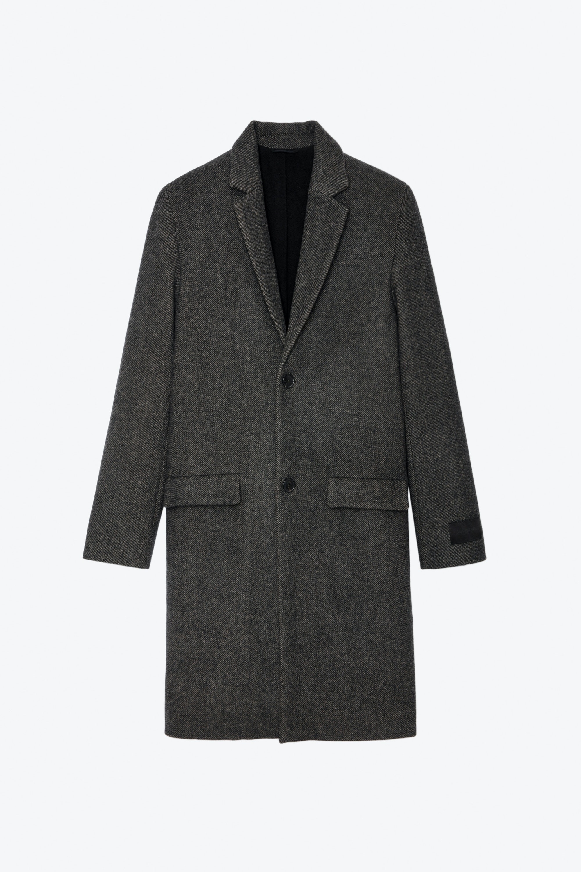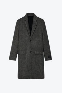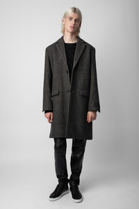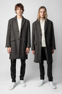 Unisex midi coat in anthracite herringbone wool with contrasting undercollar featuring the slogan “C’est la faute à Voltaire”. Description & details - Unisex anthracite wool midi coat - Herringbone pattern, lapel collar and contrasting undercollar featuring the slogan “C’est la faute à Voltaire” - 2 side pockets - Button fastening - Long sleeves, mitred cuffs and slit at the back Model is 188 cm / 6' 2" and is wearing a size M If you’re between two sizes, we recommend choosing the smaller size. Composition 70% WOOL 24% POLYAMID 3% POLYESTER 2% ACETATE 1% VISCOSE Care This garment should be dry-cleaned only. Product code: WMCO00070_ANTHRACITE