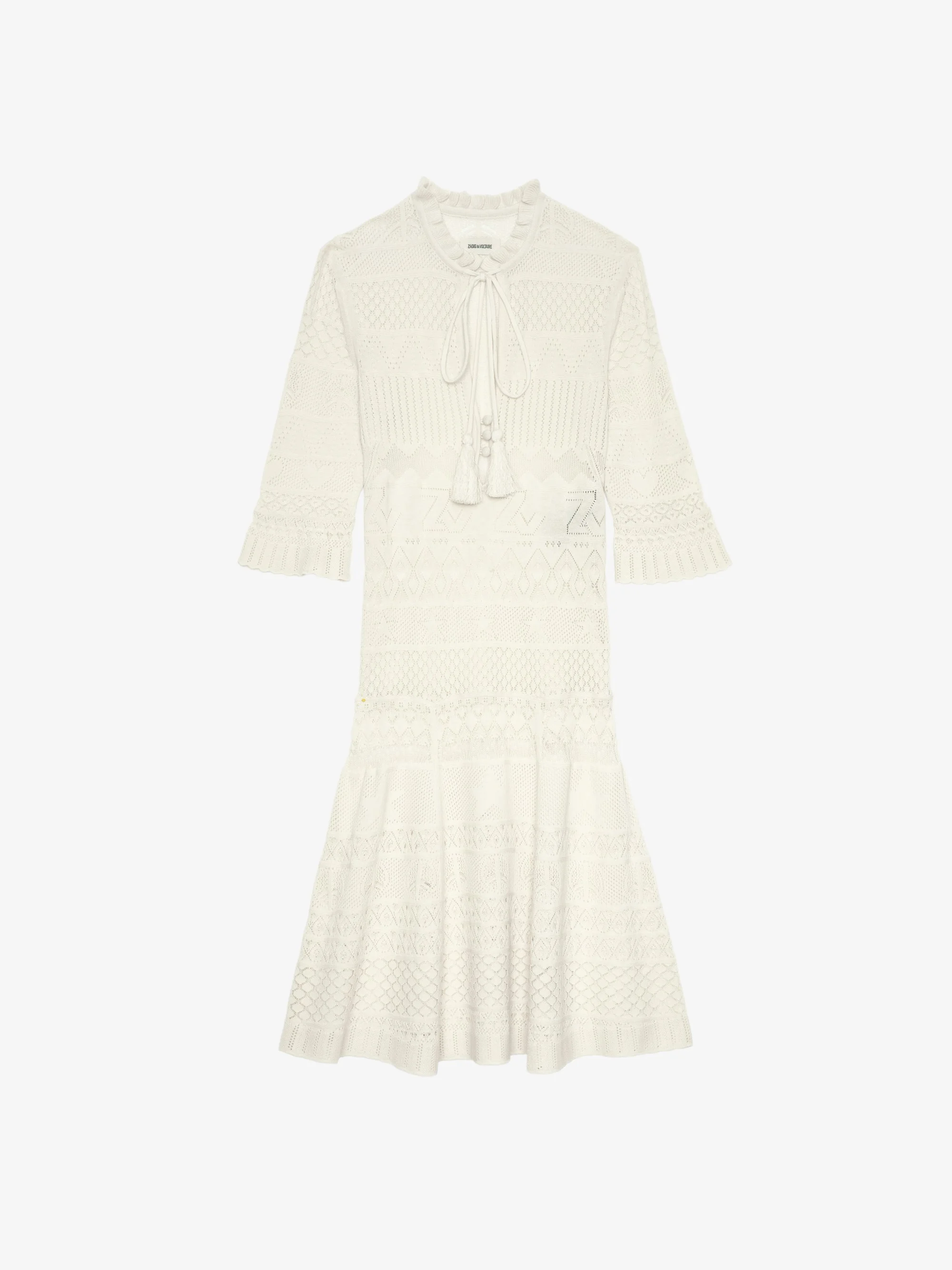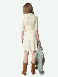 A chic fusion of bohemian charm and modern sophistication. This short dress features intricate pointelle detailing that adds a touch of elegance to its design. Crafted from 100% cotton, it offers a comfortable and breathable fit, perfect for various occasions. Embrace effortless style with this versatile piece that seamlessly transitions from day to night. Description & details - Short cotton dress - Pointelle patterns and scalloped, ribbed edges - Buttoned neckline with tassel ties - Short sleeves - Flared at the bottom Model is 171 cm / 5' 7" and is wearing a size S This item is true to size. We recommend buying your usual size. Composition 100% Cotton* Care - Machine-wash inside out on a 30°C delicate cycle with similar colours - Air dry - Iron inside out at a maximum of 110°C, avoiding any customised details Product code: KWDR01211_ECRU