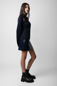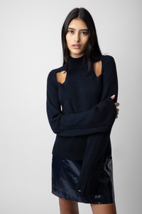 Women’s navy blue merino wool sweater with cut-outs on the shoulders and overstitching. Description & details - Women’s Encre navy blue merino wool sweater - Cut-outs on the shoulders, overstitching and ZV embroidery - Ribbed round neckline - Long sleeves and cuffs Model is 174 cm / 5' 8" and is wearing a size S This item is true to size. We recommend buying your usual size. Composition 100% WOOL MERINOS Care - Hand-wash or machine-wash on a 20°C wool cycle with a maximum spin speed of 400 rpm - Do not wring - Air dry flat - Iron inside out at a maximum of 110°C, avoiding any customised details Product code: KWSW01551_ENCRE