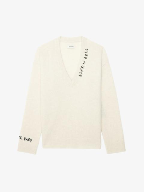 V-neck sweater with long sleeves featuring rock n roll embroidery on the neckline. Description & details - Sweater in 100% cashmere - Rock n roll embroidery on the neckline - V-neck - Long sleeves Model is 180 cm / 5' 10" and is wearing a size S This item fits true to size. Choose your usual size. Composition 100% Cashmere Care - Hand-wash or machine-wash on a 20°C wool cycle with a maximum spin speed of 400 rpm - Do not wring - Air dry flat - Iron inside out at a maximum of 110°C, avoiding any customised details Product code: KWSW02913_ENCRE