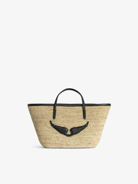 Small raffia basket with leather handles, adorned with wings. Description & details - Small Mini Wings basket in raffia - Double leather handles - Signature wings - Hand or shoulder carry 18 x 21 cm Composition 100% Rapha Product code: LWBA03656_NOIR