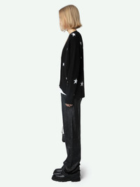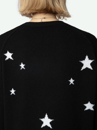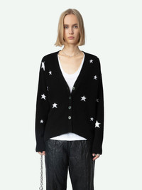 Women’s black cashmere button front cardigan with contrasting star motifs Description & details Studded with stars in intarsia jacquard, this long-sleeved button front 100% cashmere cardigan is infinitely soft. - Zadig&Voltaire women’s black cashmere cardigan - Contrasting star motifs - V neckline - Button front - Long sleeves - Ribbed cuffs and hem - 100% cashmere Model is 179 cm/5'87" and is wearing a size S Model is 170 cm / 5' 6" and is wearing a size S This item is true to size. We recommend buying your usual size. Composition 100% CASHMERE* Care Hand or machine wash your knitwear at 68°F in a pillowcase or washing bag. Do not use fabric softener or leave your knit soaking in water. The spin speed must not exceed 400 rpm. Dry flat on a towel away from direct sunlight and heat. Product code: KWCA00001_NOIR