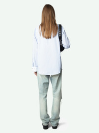 The Morning Shirt refreshes classic tailoring with a relaxed attitude. Cut from crisp cotton, this oversized striped poplin shirt features fine navy-and-ecru stripes offset by bright white French cuffs. Dropped shoulders and a long, easy silhouette soften the line, while a single chest pocket and clean button placket keep the look sharp. Wear the striped poplin shirt loose over pleated shorts on warm mornings or half-tucked into leather trousers after dark for an effortless edge. Description & details - Oversized 100 % cotton striped poplin shirt in navy and ecru - Classic shirt collar with full button front - Contrasting white cuffs, long sleeves, and dropped shoulders for a laid-back drape - Single chest pocket offers subtle utility - Curved, mid-thigh hem layers easily as a lightweight outer layer - Back box pleat increases movement, keeping the striped poplin shirt cool from day to night Model is 176 cm / 5' 9" and is wearing a size S This item is true to size. We recommend buying your usual size. Composition 100% Cotton* Care - Hand-wash or machine-wash inside out in a mesh laundry bag on a 20°C delicate cycle with a maximum spin speed of 400 rpm - Air dry flat - Iron inside out at a maximum of 110°C Product code: WWSH02165_MIST