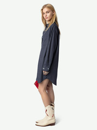 Shirt dress in striped poplin with embroidered cuffs. Description & details - Short shirt dress in navy blue Encre cotton poplin for women - Striped print and "Call Me Baby" embroidery on the left cuff - Shirt collar and button-down closure - Long sleeves with buttoned cuffs - One chest patch pocket Model is 177 cm / 5' 9" and is wearing a size S This item is true to size. We recommend buying your usual size. Composition 100% Cotton* Care - Machine-wash inside out on a 30°C delicate cycle with similar colours - Air dry - Iron inside out at a maximum of 110°C, avoiding any customised details Product code: WWDR02517_ENCRE