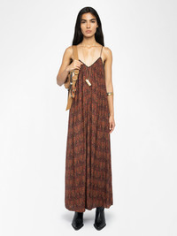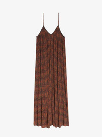 Long pleated dress in printed viscose, lingerie style, neckline with lace, and adjustable straps. Description & details - Long dress - Paisley print - V-neckline with lace - Open back with lace decolletage and tie fastening - Adjustable straps - Fluid pleated fit Model is 180 cm / 5' 10" and is wearing a size S This item fits true to size. Choose your usual size. Composition 100% Viscose** Care - Hand-wash or machine-wash inside out in a mesh laundry bag on a 20°C delicate cycle with a maximum spin speed of 400 rpm - Air dry flat - Iron inside out at a maximum of 110°C Product code: WWDR02555_BLACK
