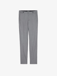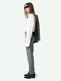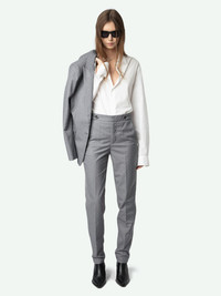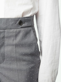 Straight-cut tailored pants with rhinestones and pockets. Description & details - Straight-cut tailored pants - Swarovski rhinestones - Zip fastening with hook and button tab at waist - 2 side pockets and 2 welt pockets at back Model is 176 cm / 5' 9" and is wearing a size 36 This item is true to size. We recommend buying your usual size. Composition 80% Polyester** 20% Viscose Care - This garment should be dry-cleaned only - Iron inside out at a maximum of 110°C, avoiding any customised details Product code: WWPA01821_GRIS CHINE