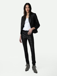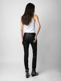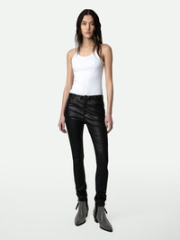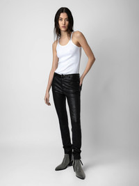 Women's black leather pants Description & details An iconic piece in the Zadig&Voltaire wardrobe, these crinkled leather pants are available in black. A must-have that works with every style. - Zadig&Voltaire Women’s pants in black crinkled leather - Button and zip closure - Belt loops at the waist - 5 pockets - Zadig&Voltaire’s signature material, crinkled leather, is obtained by means of a multi-step process developed by the Maison, guaranteeing a unique product that incorporates exceptional know-how Model is 178 cm/5'10" and is wearing a size 36 Model is 178 cm / 5' 10" and is wearing a size 36 This item is true to size. We recommend buying your usual size. Composition 100% LAMBSKIN Care This garment should be cared for by a leather professional. Product code: PWGCU1402F_NOIR
