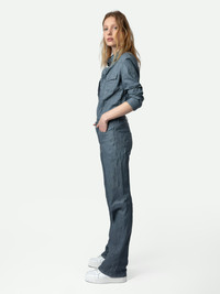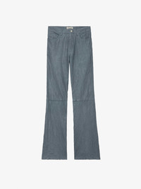 Sky blue flared tailored pants in crinkled leather with pockets. Description & details - Women’s Light Blue flared tailored pants in crinkled leather - Lengthwise pleats - High waisted - 5 pockets, belt loops at the waist and tone-on-tone jacron with wings - Zadig&Voltaire’s signature material, crinkled leather is obtained by means of a multi-step process developed by the brand, guaranteeing a unique product that showcases exceptional know-how. Model is 178 cm / 5' 10" and is wearing a size 36 If you’re between two sizes, we recommend choosing the smaller size. Composition 100% LAMBSKIN Care This garment should be cared for by a leather professional. Product code: RWPA00062_LIGHT BLUE