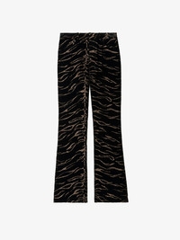 Wide straight tailored pants in tiger sequin velvet. Description & details - Wide pants in velvet - Tiger sequins - Zip and hook fastening and belt loops - 2 side pockets and 2 piped pockets at back - Regular fit - High waisted Model is 179 cm / 5' 10" and is wearing a size S This item fits true to size. Choose your usual size. Composition 82% Viscose** 18% Silk Care - Hand-wash or machine-wash on a 20°C wool cycle with a maximum spin speed of 400 rpm - Do not wring - Air dry flat - Iron inside out at a maximum of 110°C, avoiding any customised details Product code: WWPA01870_BLACK