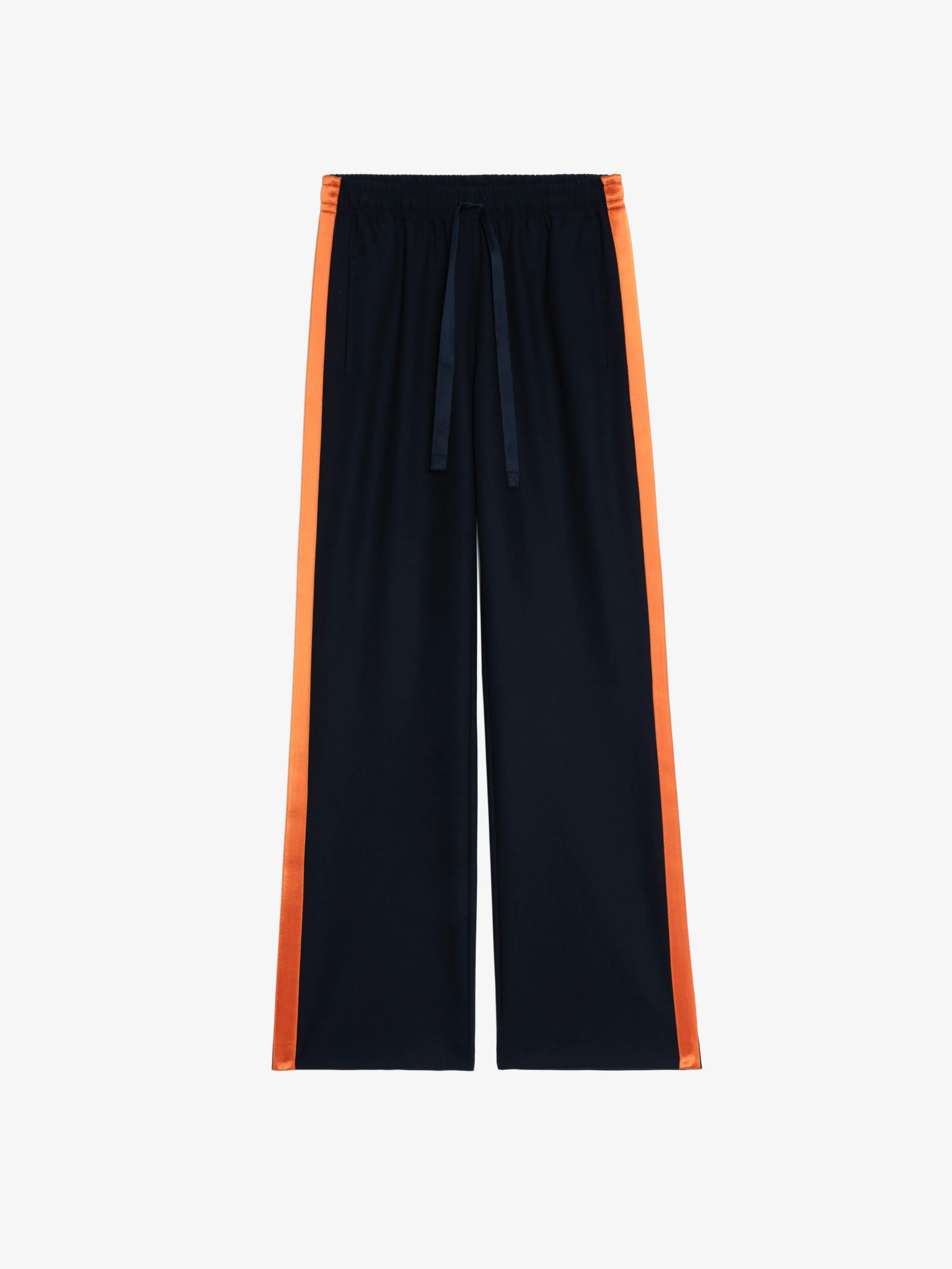 Straight tailored trousers with jogging spirit, featuring satin bands and elastic waist. Description & details - Straight tailored trousers with jogging spirit - Satin bands - Piped pockets - Low-rise elastic waist Model is 177 cm / 5' 9" and is wearing a size 34 This item fits true to size. Choose your usual size. Composition 43% Polyester** 26% Polyester 23% Viscose** 8% Elasthanne Care - This garment should be dry-cleaned only - Iron inside out at a maximum of 110°C, avoiding any customised details Product code: WWPA01878_ENCRE