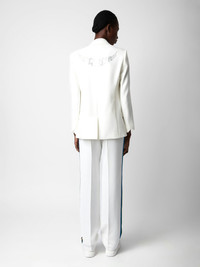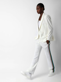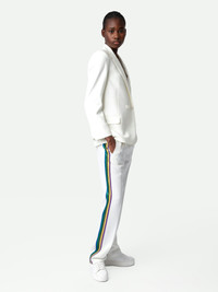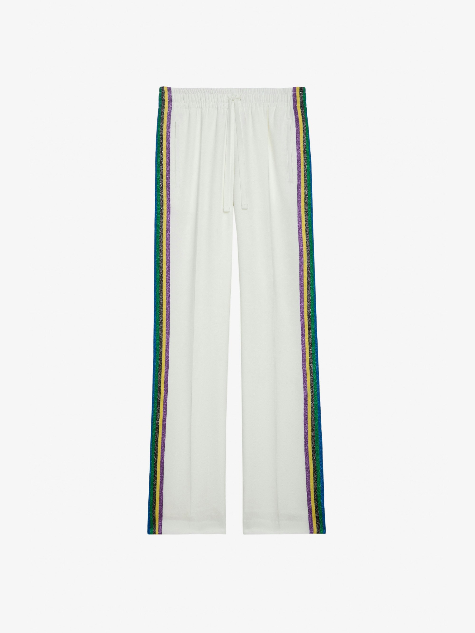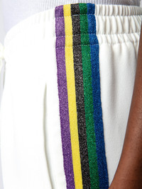 White crêpe pants with glittery side bands and drawstring ties. Description & details - Women’s Judo white flowing crêpe pants - Multicolored glittery side bands - Drawstring at the waist and 2 side pockets - Made in Portugal Model is 177 cm / 5' 9" and is wearing a size S This item is true to size. We recommend buying your usual size. Composition 56% POLYESTER 44% POLYESTER** Care Pants should be dry-cleaned only. Nonetheless, it is possible to smooth out creases by steaming from a distance of 8 in. Product code: WWPA00017_JUDO