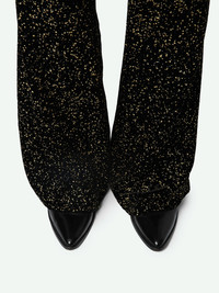 Black sequin flare pants with mid-rise waist, sequins, and pockets. Description & details - Women's black sequin flare pants - Gold sequin motifs - Mid-rise waist - Zip and hook fastening and belt loops - 2 side pockets and 2 welt pockets at the back - Flared hem - Black sequin flare pants made of French fabric Model is 176 cm / 5' 9" and is wearing a size 36 If you’re between two sizes, we recommend choosing the larger size. Composition 82% Viscose 18% Silk Care - This garment should be dry-cleaned only - Iron inside out at a maximum of 110°C, avoiding any customised details Product code: WWPA00811_NOIR