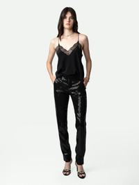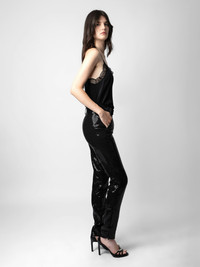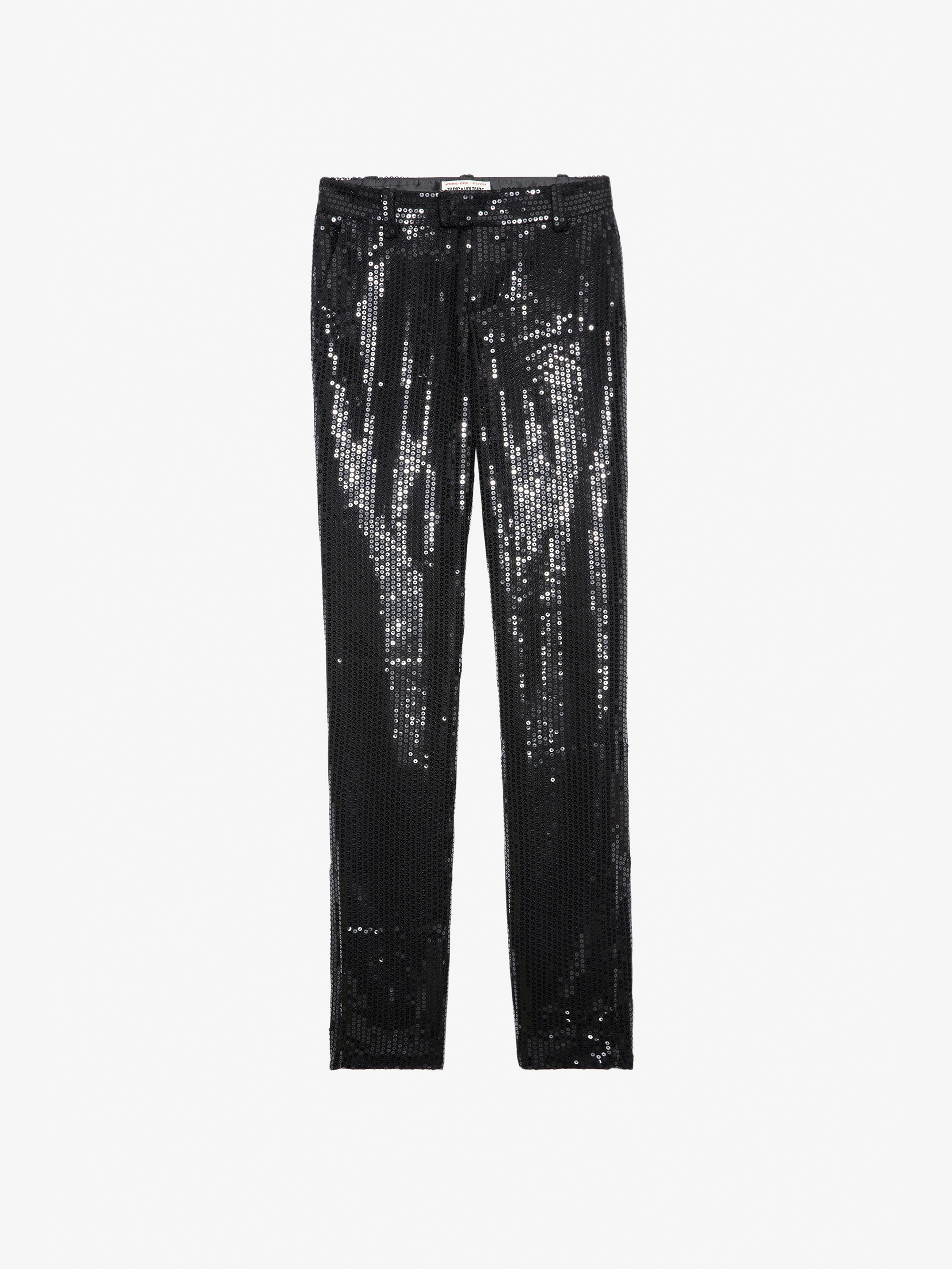 Women’s black tailored pants with sequins, pockets and zip hem. Description & details - Women’s black tailored pants - Sequins - Mid rise - Zip and button fastening, belt loops at the waist - 2 side pockets and 1 buttoned flap pocket and 1 piped pocket on back - Split, zipped hems Model is 179 cm / 5' 10" and is wearing a size 36 This item is true to size. We recommend buying your usual size. Composition 64% POLYESTER 34% VISCOSE 2% ELASTANE Care Suits should be dry-cleaned only. Product code: WWPA00777_NOIR