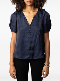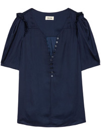 puff-sleeve satin top Highlights - Sailor blue - Satin finish - Short front button fastening - Ruffled detailing - Short puff sleeves - Straight hem Imported Composition Polyester 100% SIZE & FIT FittingInformation Designed for a relaxed fit, this piece allows for comfort and movement when worn Made from a midweight non-stretch fabric This piece fits true to size – take your usual size Washing instructions Read Manufacturer Guidelines