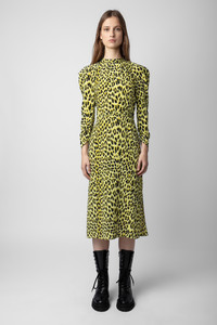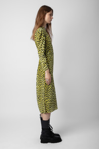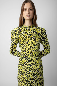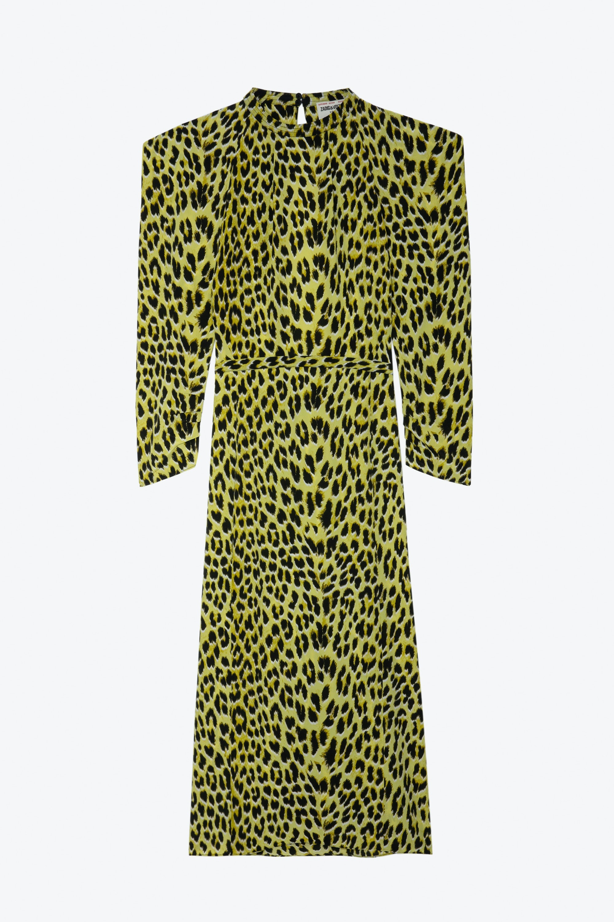 Women’s long yellow leopard-print silk dress with shoulder pads, belt and cut-out on back. Description & details - Women’s long flowing Jonquil yellow dress - Leopard-print silk - Round button collar and cut-out on back - Shoulder pads and long sleeves - Tie belt at waist and skirt with side slits Model is 180 cm / 5' 10" and is wearing a size S This item is true to size. We recommend buying your usual size. Composition 100% SILK Care Hand-wash or machine-wash your garment at a maximum of 68°F, in a mesh laundry bag and inside out, with a gentle spin cycle. Air-dry. Iron your garment on a low heat setting or steam from a distance of 8", being particularly careful with customized details. Product code: WWDR01262_JONQUIL