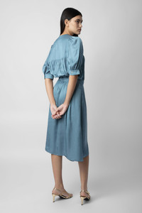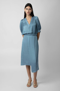 Women's mid-length light satin dress with short puff sleeves Description & details The lightweight satin Ralia dress features a deep neckline and short puff sleeves. The skirt has a wrapover cut and the dress is delicately cinched at the waist to structure the figure. Team it with trainers or high heels. - Zadig&Voltaire women’s mid-length dress in satin - Short buttoned puff sleeves - Deep neckline - Wrapover skirt - Fitted waistband - Made in China - Product code: WWDR01161_TONNERRE - GRS certification guarantees the presence and quantity of recycled material in the product. It ensures a social, environmental and chemical responsible management, as well as an end-to-end traceability of the recycled material through the supply chain. Model is 175 cm / 5' 8" and is wearing a size S This item is true to size. We recommend buying your usual size. Composition 57% Polyester** 43% Polyester Care Hand-wash or machine-wash your garment at a maximum of 20 °C, in a mesh laundry bag and inside out, with a gentle spin cycle. Air-dry. Iron your garment on a low heat setting or steam from a distance of 20 cm, being particularly careful with customised details. Product code: WWDR01161_TONNERRE
