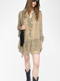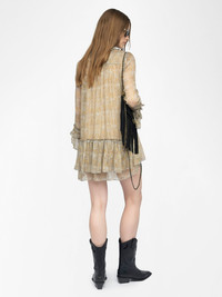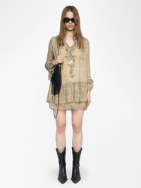 Short ruffled dress in printed chiffon with golden stripes, long sleeves. Description & details - Short chiffon dress - Printed with golden stripes - Deep neckline - Long sleeves - Fluid cut Model is 180 cm / 5' 10" and is wearing a size S This item fits true to size. Choose your usual size. Composition 97% Viscose** 3% Metallic fiber Care - Hand-wash or machine-wash inside out in a mesh laundry bag on a 20°C delicate cycle with a maximum spin speed of 400 rpm - Air dry flat - Iron inside out at a maximum of 110°C Product code: WWDR02541_CLOUD