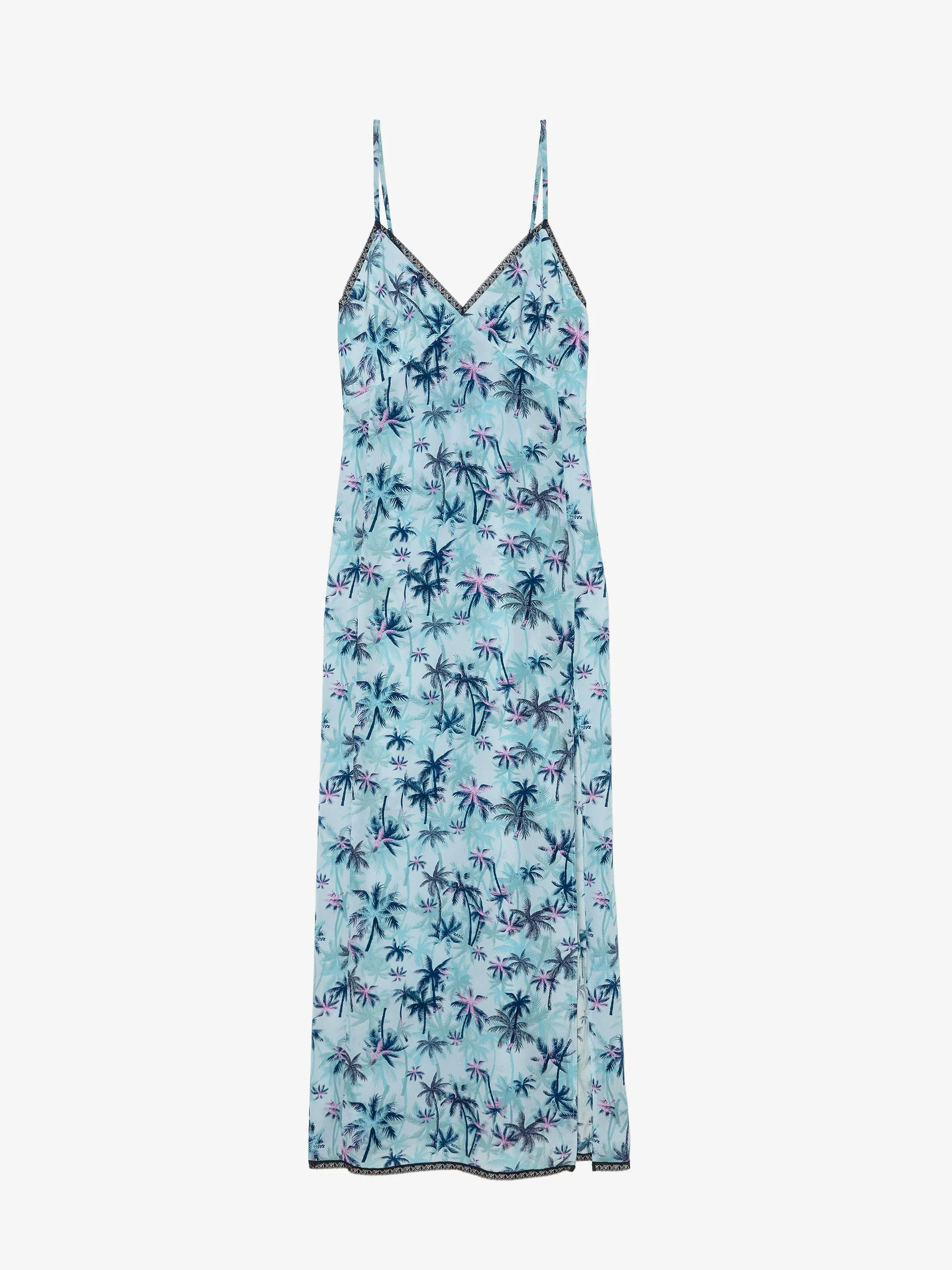 This long, lingerie-inspired dress is crafted from 100 % silk printed with the house’s Tropical Island artwork. Delicate lace outlines the neckline and hem, and signature wing embroidery rests between the shoulder blades. A fluid slit skirt and adjustable straps keep the fit easy and the look effortless, making the Ramelil a true silk vacation dress, equally at home on sun-warmed sand or under city lights. Description & details - Long silk vacation dress in the Tropical Island print - Lace-trimmed V-neckline; thin adjustable straps for a custom fit - Signature wing embroidery at the upper back adds a subtle edge - Side slit gives the silk vacation dress graceful movement and breathability - Lightweight, unlined construction packs small and moves comfortably from day to night Model is 171 cm / 5' 7" and is wearing a size S This item is true to size. We recommend buying your usual size. Composition 100% Silk Care - Hand-wash or machine-wash inside out in a mesh laundry bag on a 20°C delicate cycle with a maximum spin speed of 400 rpm - Air dry flat - Iron inside out at a maximum of 110°C Product code: WWDR02531_MIST