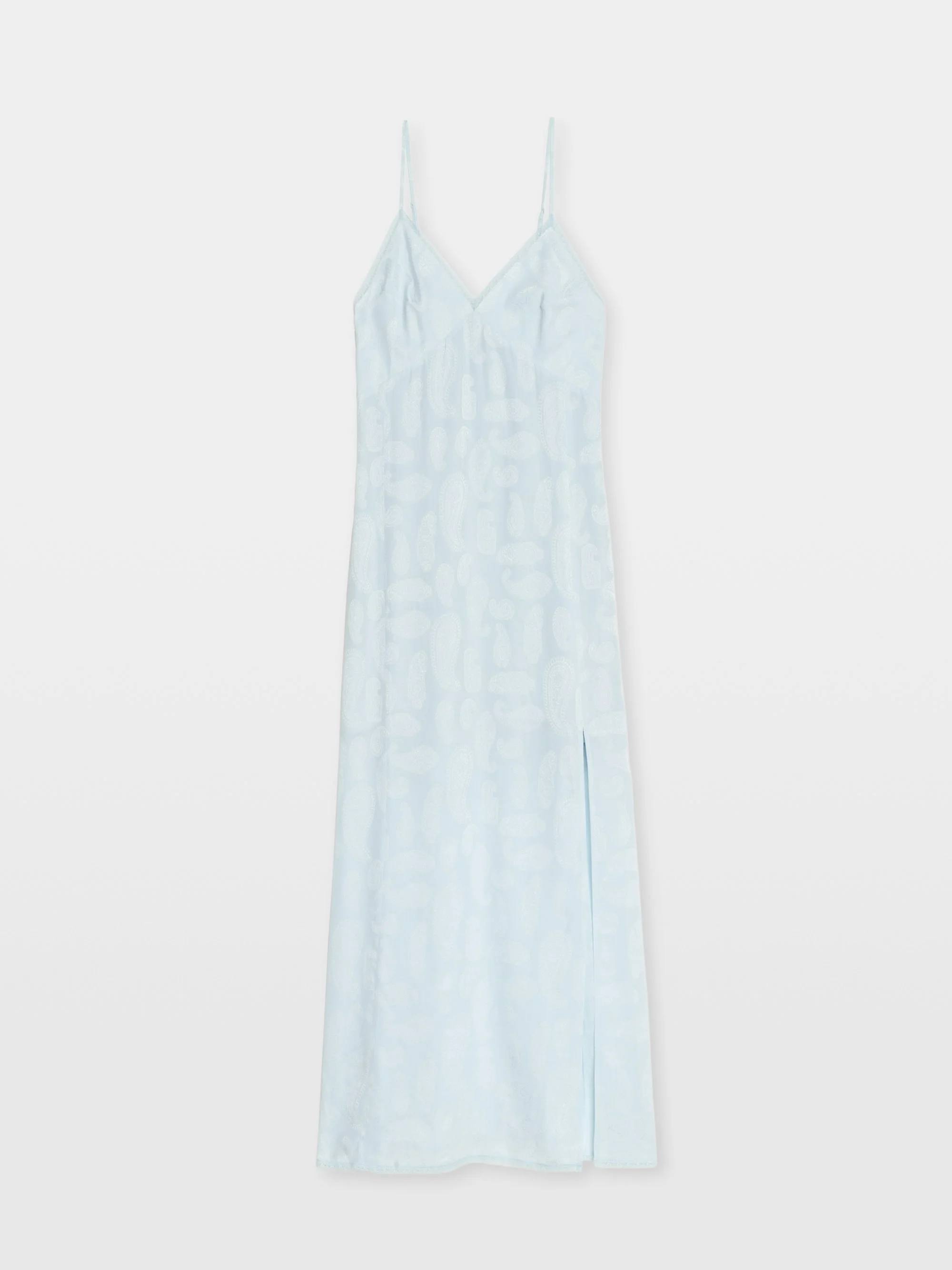 Long lingerie-inspired dress in jacquard silk, with slit, adjustable straps, back wing embroidery and lace. Description & details - Long dress in 100% silk - Paisley jacquard - V-neckline - Adjustable straps - Back wing embroidery - Lace - Slit Model is 181 cm / 5' 11" and is wearing a size S This item fits true to size. Choose your usual size. Composition 100% Silk Care - Hand-wash or machine-wash inside out in a mesh laundry bag on a 20°C delicate cycle with a maximum spin speed of 400 rpm - Air dry flat - Iron inside out at a maximum of 110°C Product code: WWDR02660_BABY BLUE