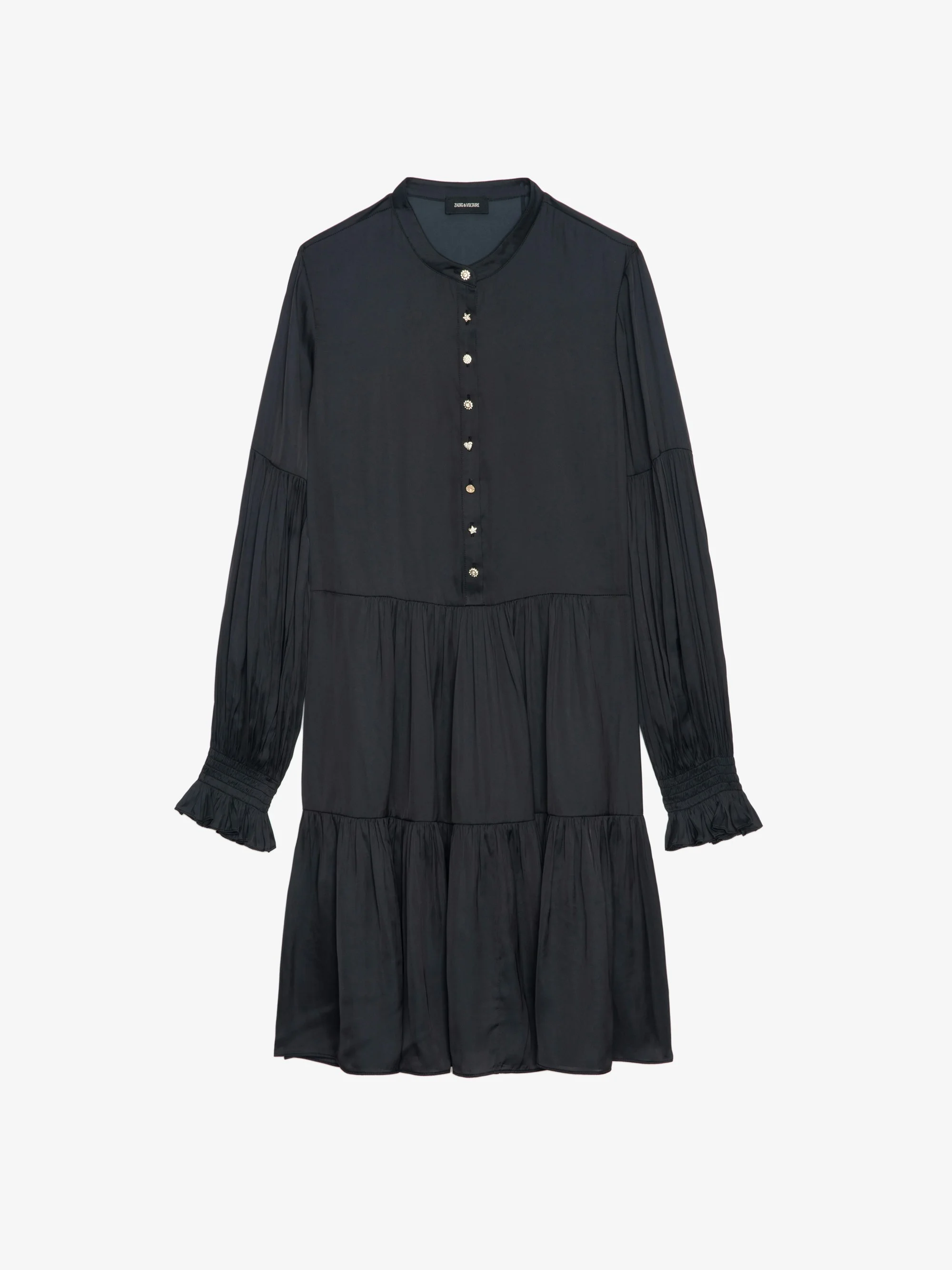 Short black satin dress with long sleeves and buttoned neckline. Description & details - Women's short Japanese satin dress in black - Round neck with jewelled button fastening - Long sleeves with frilled cuffs - Short black satin dress with slightly flared skirt - Pleated and frilled details Model is 177 cm / 5' 9" and is wearing a size S This item is true to size. We recommend buying your usual size. Composition 57% Polyester** 43% Polyester Care - Hand-wash or machine-wash inside out in a mesh laundry bag on a 20°C delicate cycle with a maximum spin speed of 400 rpm - Air dry flat - Iron inside out at a maximum of 110°C Product code: WWDR02451_BLACK