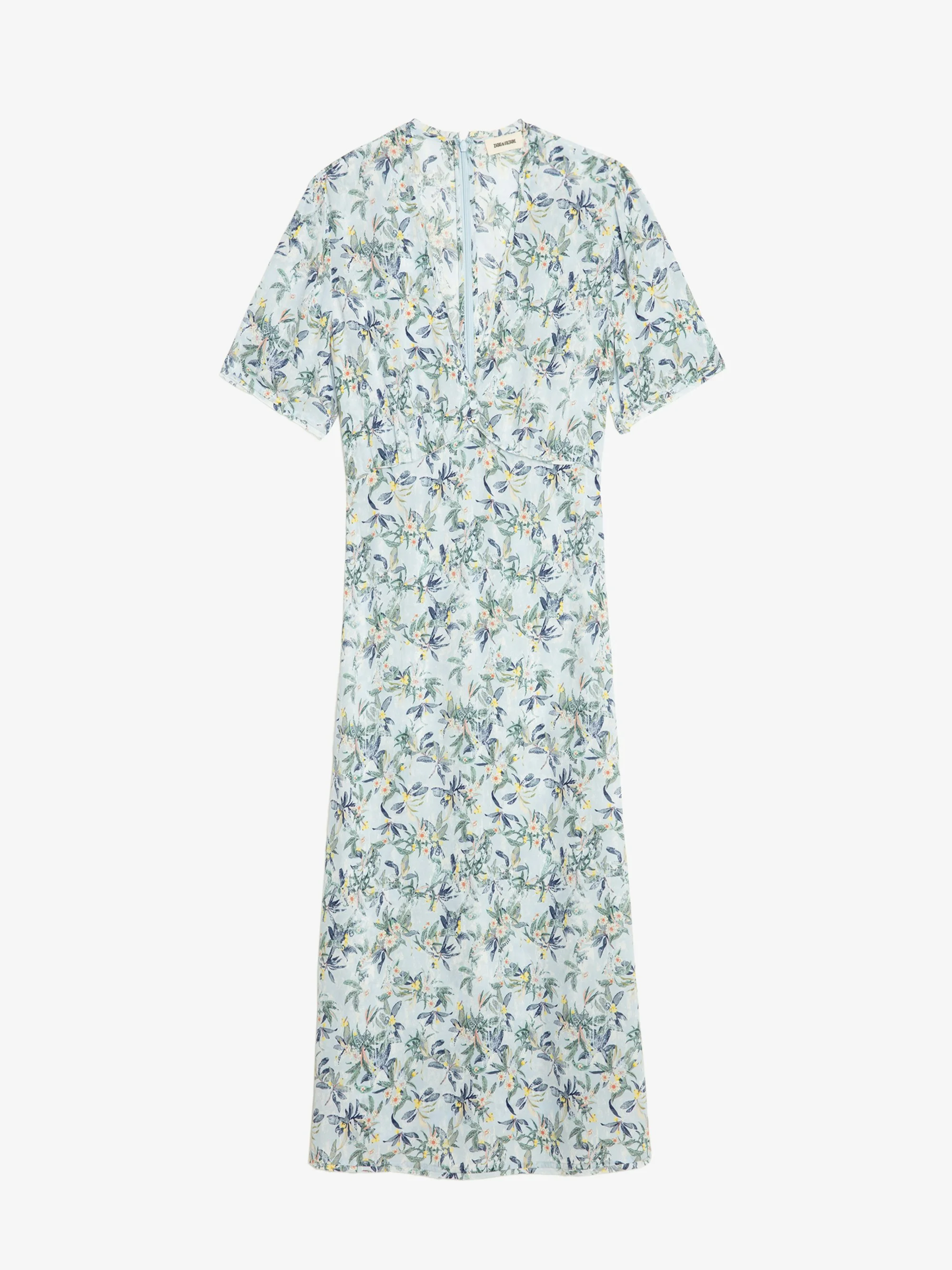 Mid-length printed viscose dress with short sleeves and buttoned neckline. Description & details - Mid-length dress in 100% viscose - Floral print - V-neck - Short sleeves - Back zip fastening - Fluid fit Model is 175 cm / 5' 8" and is wearing a size S This item fits true to size. Choose your usual size. Composition 100% Viscose Care - Hand-wash or machine-wash inside out in a mesh laundry bag on a 20°C delicate cycle with a maximum spin speed of 400 rpm - Air dry flat - Iron inside out at a maximum of 110°C Product code: WWDR02599_CLOUD