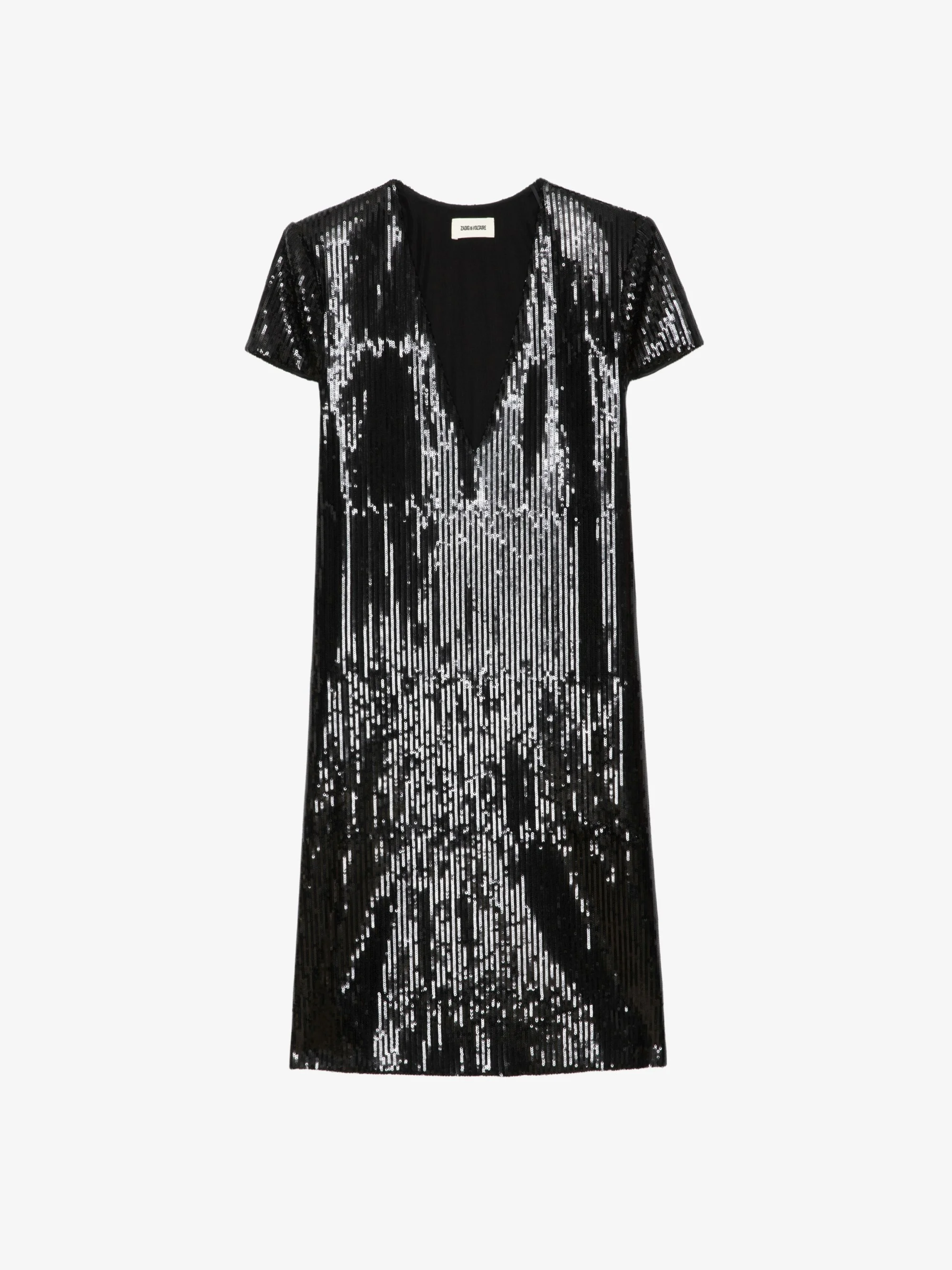Black sequin mini dress with plunging V neckline and short sleeves. Description & details - Women's black sequin mini dress - Sequins - Plunging V neckline - Short sleeves - Black sequin mini dress with lining Model is 178 cm / 5' 10" and is wearing a size S If you’re between two sizes, we recommend choosing the larger size. Composition 100% Polyester Care - Hand-wash or machine-wash inside out in a mesh laundry bag on a 20°C delicate cycle with a maximum spin speed of 400 rpm - Air dry flat - Iron inside out at a maximum of 110°C Product code: WWDR01306_NOIR