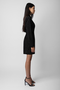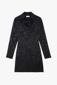 Women’s short black silk dress in star-print jacquard. Description & details - Women’s short structured black dress - Star jacquard silk - Shirt collar and wrap neckline - Long sleeves and buttoned cuffs - Smocked on the back Model is 174 cm / 5' 8" and is wearing a size S This item is true to size. We recommend buying your usual size. Composition 100% SILK Care Hand-wash or machine-wash your garment at a maximum of 68°F, in a mesh laundry bag and inside out, with a gentle spin cycle. Air-dry. Iron your garment on a low heat setting or steam from a distance of 8", being particularly careful with customized details. Product code: WWDR01275_NOIR