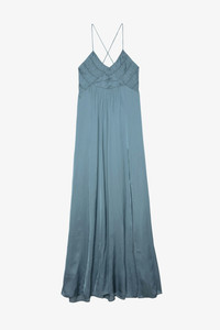 Women's long dress in gathered blue satin with thin straps Description & details The Rayonne dress features many elegant details with a front slit revealing the leg, a bib with elaborate gathering and thin straps that cross over at the back. - Zadig&Voltaire women's long dress - Thin, crossed straps - Detailed front - Front slit - Product code: WWDR01076 Model is 178 cm / 5' 10" and is wearing a size S This item is true to size. We recommend buying your usual size. Composition 57% Polyester** 43% Polyester Care Hand-wash or machine-wash your garment at a maximum of 20 °C, in a mesh laundry bag and inside out, with a gentle spin cycle. Air-dry. Iron your garment on a low heat setting or steam from a distance of 20 cm, being particularly careful with customised details. Product code: WWDR01076_TONNERRE