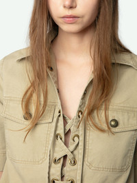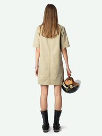 Short military-style dress in washed cotton, short sleeves, laced neckline, and multiple pockets. Description & details - Short military-style dress in washed cotton - Shirt collar and laced neckline - 4 pockets with buttoned flap - Short sleeves - Slightly flared skirt Model is 177 cm / 5' 9" and is wearing a size S This item is true to size. We recommend buying your usual size. Composition 100% Cotton** Care - Machine-wash inside out on a 30°C delicate cycle with similar colours - Air dry - Iron inside out at a maximum of 110°C, avoiding any customised details Product code: WWDR02512_ERABLE
