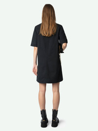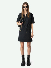 Short military-inspired dress in washed cotton, short sleeves, laced neckline, and multiple pockets. Description & details - Short military-inspired dress in washed cotton - Shirt collar and laced neckline - 4 pockets with buttoned flaps - Short sleeves - Slightly flared skirt Model is 176 cm / 5' 9" and is wearing a size S This item is true to size. We recommend buying your usual size. Composition 100% Cotton** Care - Machine-wash inside out on a 30°C delicate cycle with similar colours - Air dry - Iron inside out at a maximum of 110°C, avoiding any customised details Product code: WWDR02512_BLACK