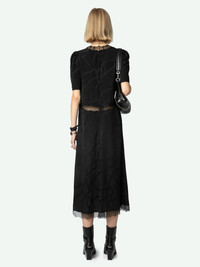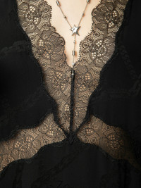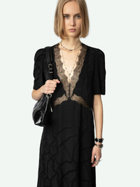 Black silk lingerie-style midi dress with jacquard chains, short sleeves and lace detailing. Description & details - Women's black silk lingerie-style midi dress - Jacquard chains and lace bands - V neckline - Zip fastening at the back - Gathered shoulders and short sleeves Model is 176 cm / 5' 9" and is wearing a size S This item is true to size. We recommend buying your usual size. Composition 100% Silk Care - Hand-wash or machine-wash inside out in a mesh laundry bag on a 20°C delicate cycle with a maximum spin speed of 400 rpm - Air dry flat - Iron inside out at a maximum of 110°C Product code: WWDR01383_NOIR