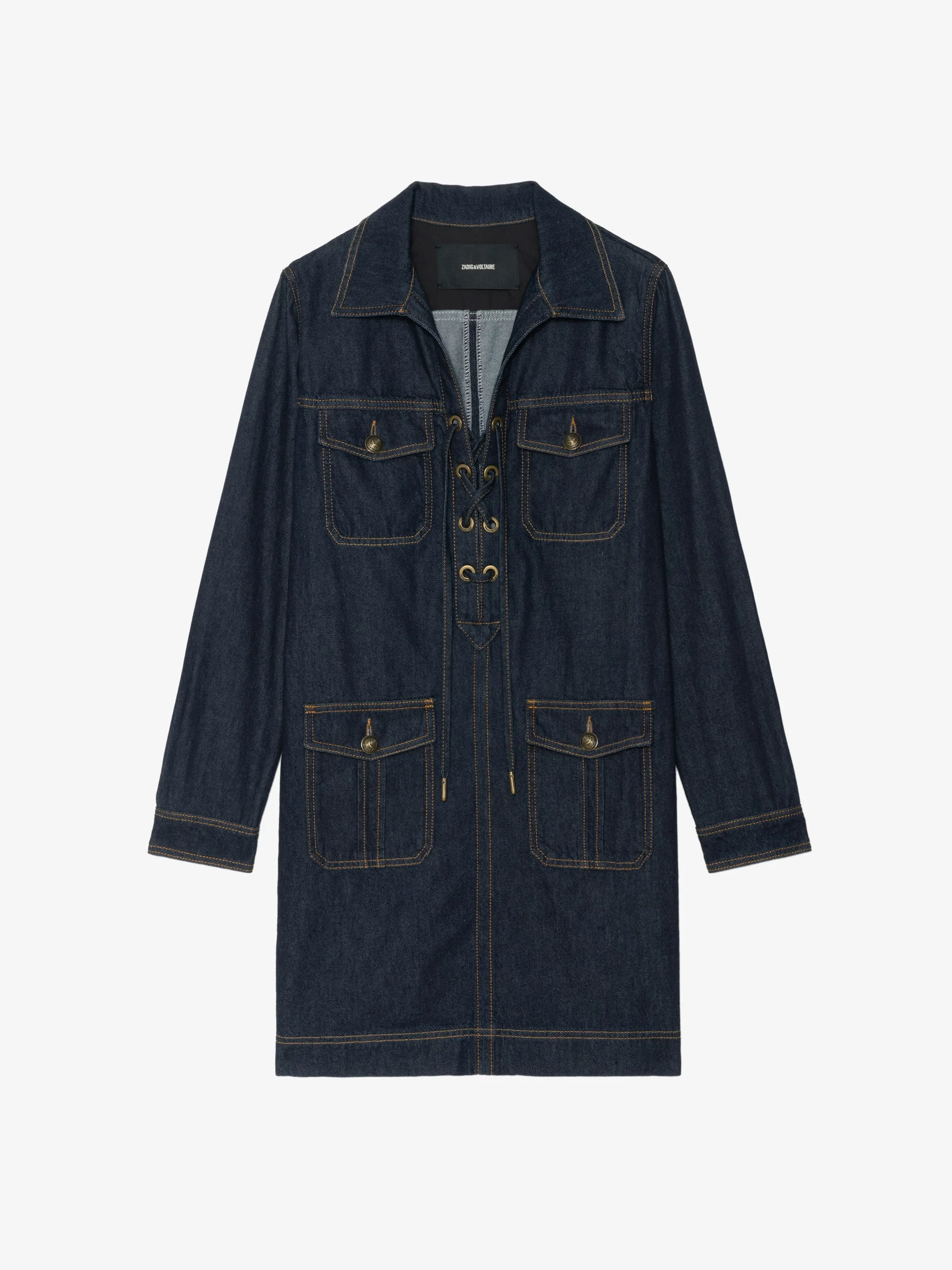 Short dress in raw denim, long sleeves, applied military-style pockets and deep laced neckline. Description & details - Short dress in raw denim - Deep laced neckline - Applied military-style pockets - Long sleeves - Trapeze cut Model is 178 cm / 5' 10" and is wearing a size S This item fits true to size. Choose your usual size. Composition 100% Cotton* Care - Machine-wash inside out on a 30°C delicate cycle with similar colours - Air dry - Iron inside out at a maximum of 110°C, avoiding any customised details Product code: WWDR02576_BRUT