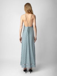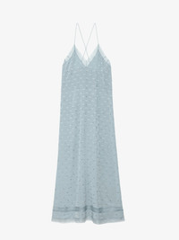 Sky blue silk lingerie-style long dress with jacquard wings, diamanté, lace and tie at the back. Description & details - Women’s Glacier sky blue lingerie-style long dress - Silk with jacquard wings and diamanté - V neckline and contrasting lace trim - Thin straps and ties at the back Model is 178 cm / 5' 10" and is wearing a size S This item runs large. We recommend buying one size smaller than your usual size. Composition 100% SILK Care - Hand-wash or machine-wash inside out in a mesh laundry bag on a 20°C delicate cycle with a maximum spin speed of 400 rpm - Air dry flat - Iron inside out at a maximum of 110°C Product code: WWDR01337_GLACIER
