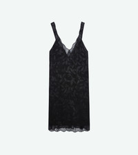 Women’s short black silk dress with jacquard floral print and lace trim. Description & details - Women’s short black silk dress - Floral jacquard - Wide straps - V neckline and scalloped lace trim - Diamanté on the bottom Model is 179 cm / 5' 10" and is wearing a size S This item is true to size. We recommend buying your usual size. Composition 100% SILK Care Hand-wash or machine-wash your garment at a maximum of 68°F, in a mesh laundry bag and inside out, with a gentle spin cycle. Air-dry. Iron your garment on a low heat setting or steam from a distance of 20 cm, being particularly careful with customized details. Product code: WWDR01273_NOIR