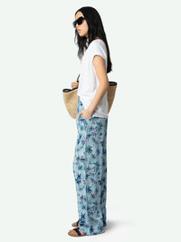 Pyjama-style pants in jacquard silk with pockets and elastic waistband. Description & details - Pyjama-style pants in silk - Sunset palm print - Elasticated waist - One pocket - Hem effect at the bottom This item fits true to size. Choose your usual size. Composition 100% Silk Product code: WWPA01860_MIST
