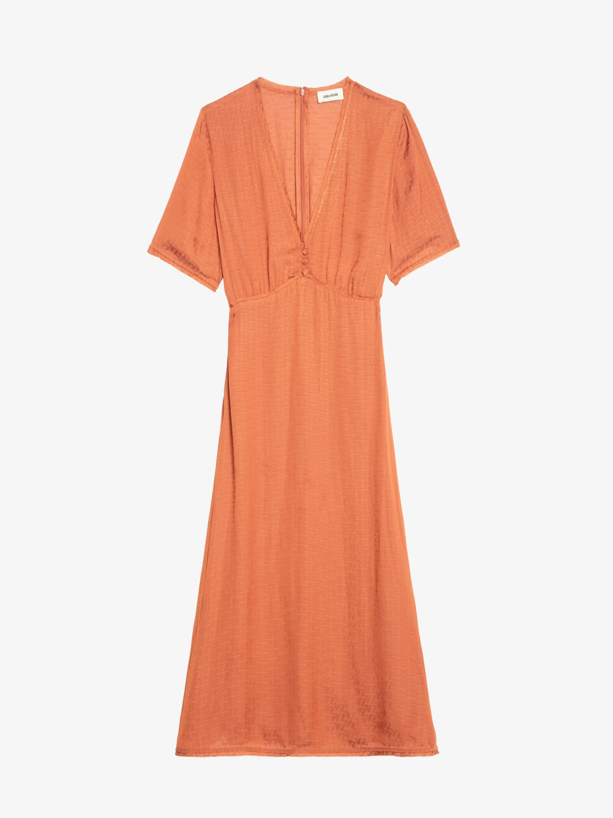 Mid-length dress in ZV jacquard satin, short sleeves and buttoned neckline. Description & details - Mid-length jacquard satin dress - Buttoned V-neck - Short sleeves - Back zip fastening - Fluid fit Model is 175 cm / 5' 8" and is wearing a size S This item fits true to size. Choose your usual size. Composition 65% Polyester** 35% Polyester Care - Hand-wash or machine-wash inside out in a mesh laundry bag on a 20°C delicate cycle with a maximum spin speed of 400 rpm - Air dry flat - Iron inside out at a maximum of 110°C Product code: WWDR02583_SIENNA