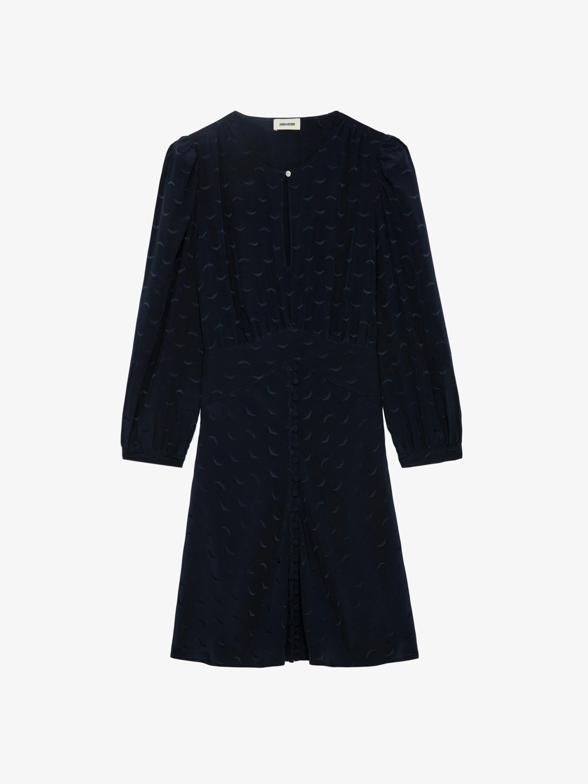 Short navy blue silk dress with jacquard wings, button closure and 3/4-length sleeves. Description & details - Women’s Encre navy blue fitted, flowing mini dress - Silk with jacquard wings - Round neckline and diamanté jewel button - Pleat details and button tab - Gathers on the shoulders, 3/4-length sleeves and buttoned cuffs Model is 178 cm / 5' 10" and is wearing a size S This item is true to size. We recommend buying your usual size. Composition 100% SILK Care - Hand-wash or machine-wash inside out in a mesh laundry bag on a 20°C delicate cycle with a maximum spin speed of 400 rpm - Air dry flat - Iron inside out at a maximum of 110°C Product code: WWDR01331_ENCRE