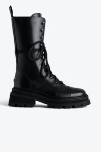 Women’s high ankle boots in black semi-patent smooth leather with wings charm and laces. Description & details - Women’s black semi-patent smooth leather long ankle boots - Metal wings charm and Voltaire-branded back tab - Stud buttons, laces and inside leg zip fastening - Cleated sole - Heel height: 2.8 in - Made in Portugal This item is true to size. We recommend buying your usual size. Composition 100% COW LEATHER Care - Protect your leather item from humidity and any source of heat (radiator, sun) - Avoid your item coming into contact with water - Regularly maintain the shine of your smooth or grained leather shoes with a leather polish Product code: SWCT00807_NOIR