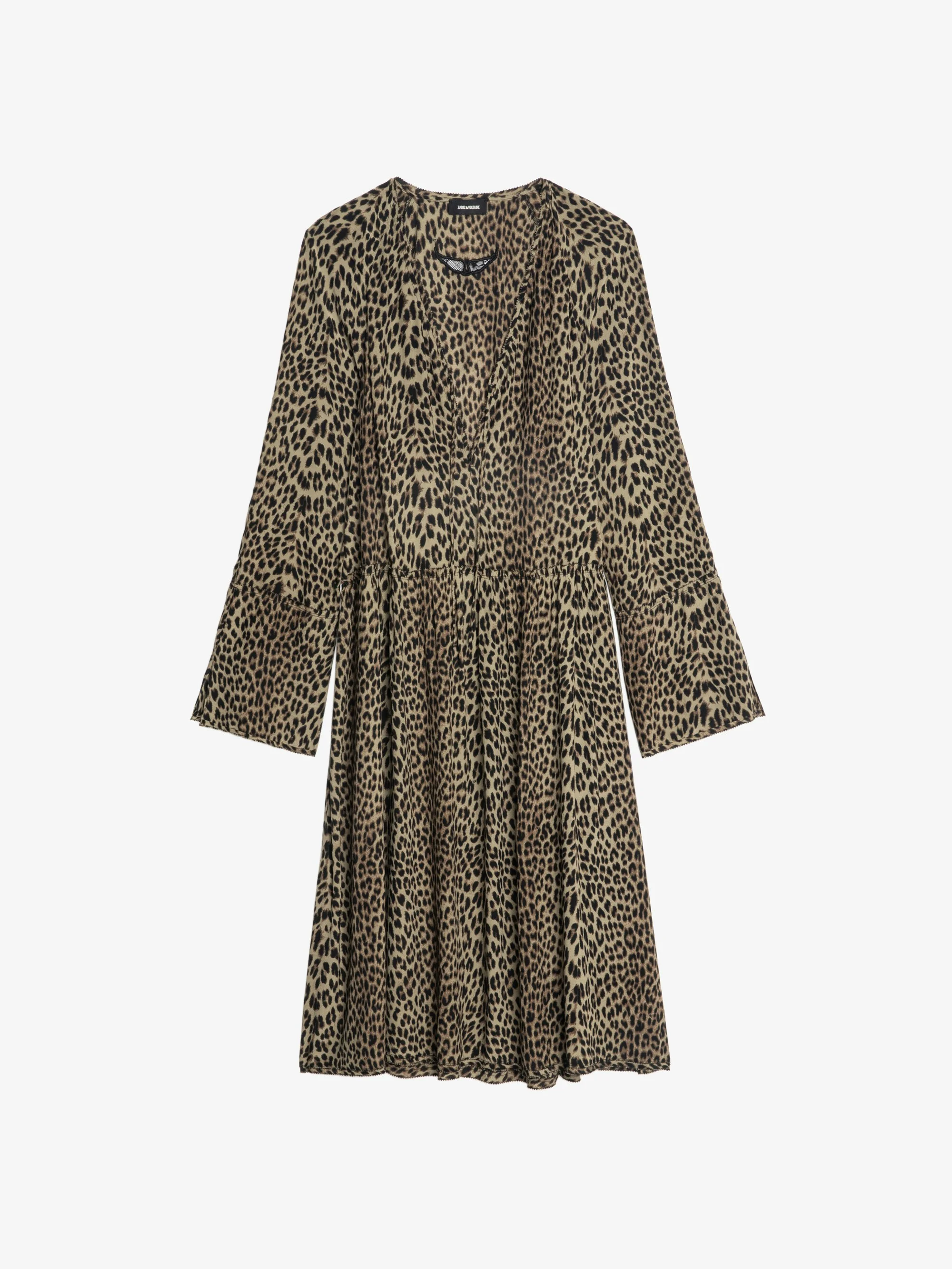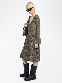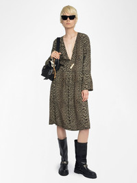 Mid-length printed viscose dress, long sleeves, laced neckline. Description & details - Mid-length dress - Leopard print - Deep laced V-neckline - Long sleeves - Fluid cut Model is 180 cm / 5' 10" and is wearing a size S This item fits true to size. Choose your usual size. Composition 100% Viscose** Care - Hand-wash or machine-wash inside out in a mesh laundry bag on a 20°C delicate cycle with a maximum spin speed of 400 rpm - Air dry flat - Iron inside out at a maximum of 110°C Product code: WWDR02568_LEAVES