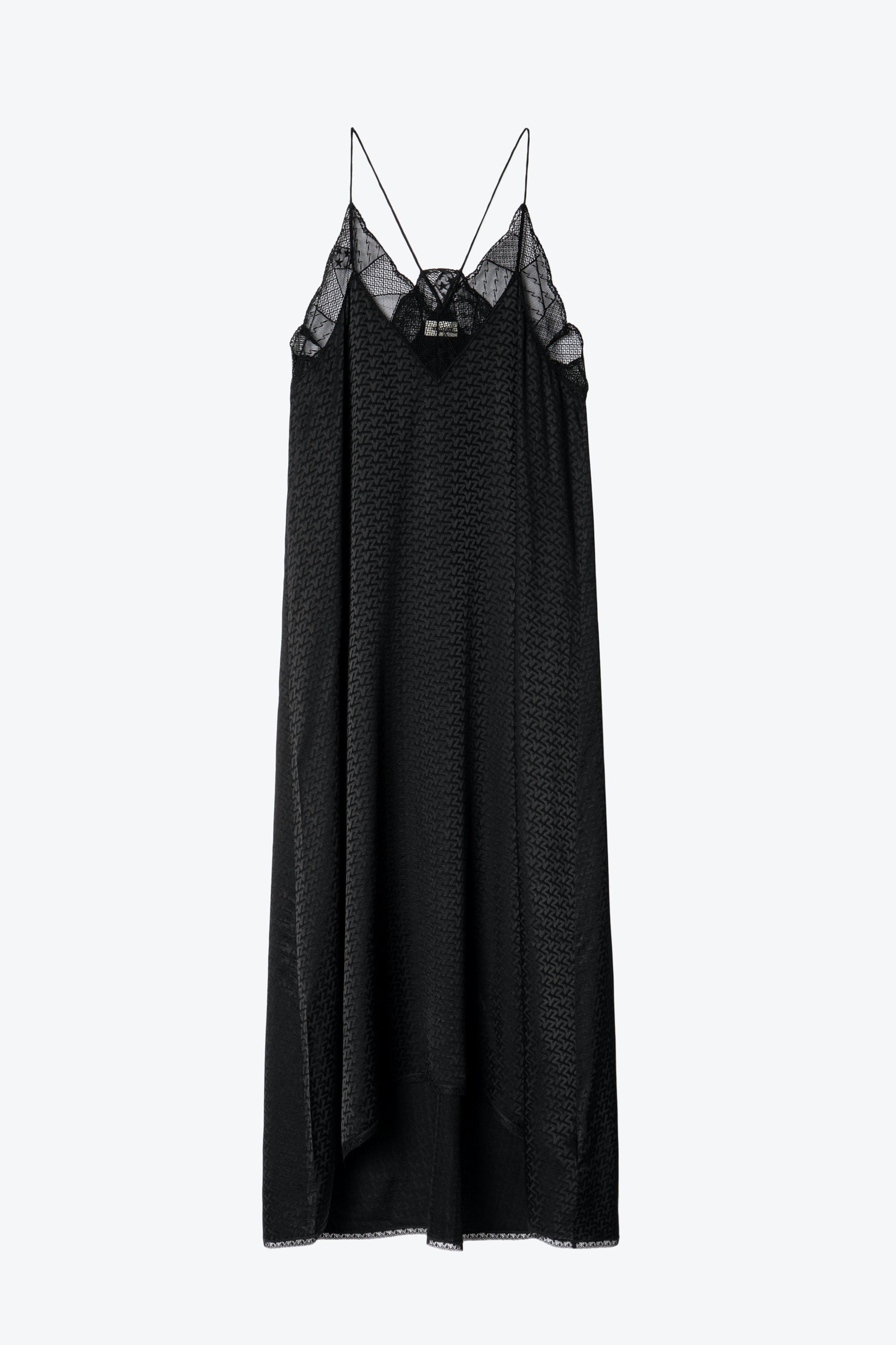Women’s black silk jacquard dress. Description & details Zadig&Voltaire women’s black silk jacquard dress with ZV monogram, lace embellishment and a lingerie vibe. Model is 175 cm/5'9" and is wearing a size S Model is 175 cm / 5' 8" and is wearing a size S This item is true to size. We recommend buying your usual size. Composition 100% SILK Care - Hand-wash or machine-wash inside out in a mesh laundry bag on a 20°C delicate cycle with a maximum spin speed of 400 rpm - Air dry flat - Iron inside out at a maximum of 110°C Product code: SKCP0427F_NOIR