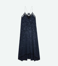 Women’s long navy blue floral silk jacquard with lace trim. Description & details - Women’s long Encre navy blue silk dress - Floral jacquard - V neckline and lace trim - Thin straps - Asymmetric at the bottom Model is 179 cm / 5' 10" and is wearing a size S This item is true to size. We recommend buying your usual size. Composition 100% SILK Care Hand-wash or machine-wash your garment at a maximum of 68°F, in a mesh laundry bag and inside out, with a gentle spin cycle. Air-dry. Iron your garment on a low heat setting or steam from a distance of 8 in, being particularly careful with customized details. Product code: WWDR01272_ENCRE